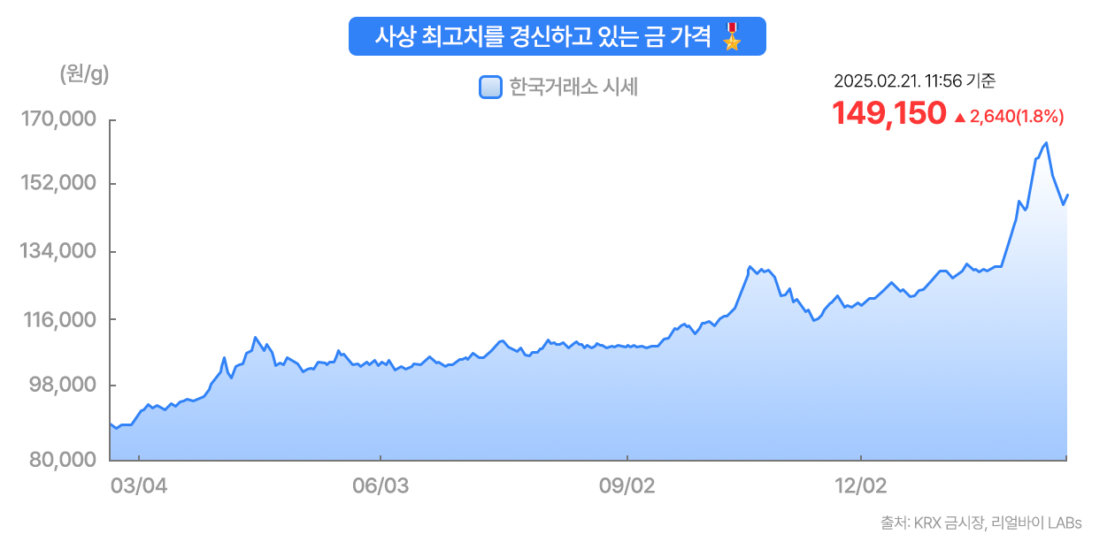 요즘 뉴스나 주변에서 “금값이 또 올랐다더라”라는 말을 자주 들어보셨을 것 같은데요. 2025년 2월 현재 금값은 온스당 $2,938(약 868만 원/10g)로 사상 최고치를 경신했다고 해요(국내 금값 559,312원/1돈, 한국거래소). 보통 ‘고금리’ · ‘강달러’ 구간에는 금값이 주춤하는 것이 일반적이지만, 이번에는 좀 다르게 흘러가고 있죠.