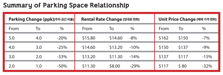 미국의 한 연구에 따르면, 오피스 건물의 주차 비율(Parking Ratio, PPK)이 5.0에서 1.0으로 줄었을 때